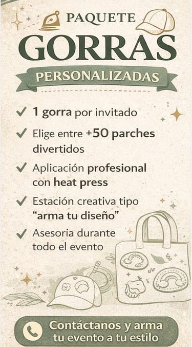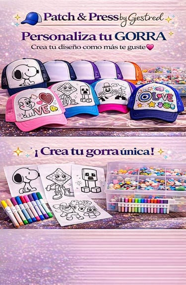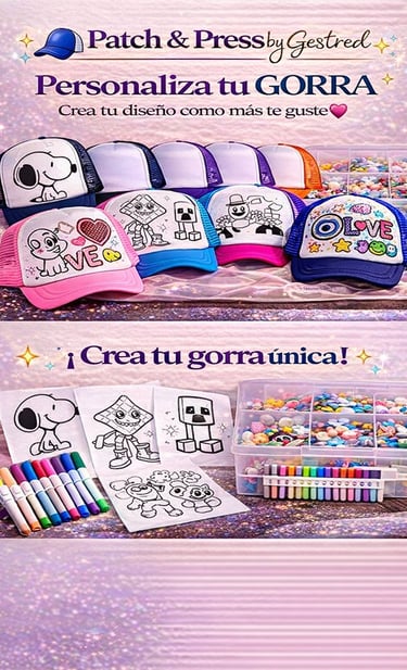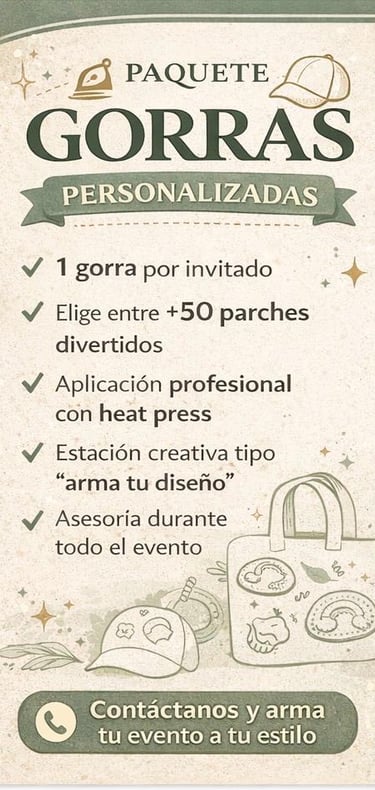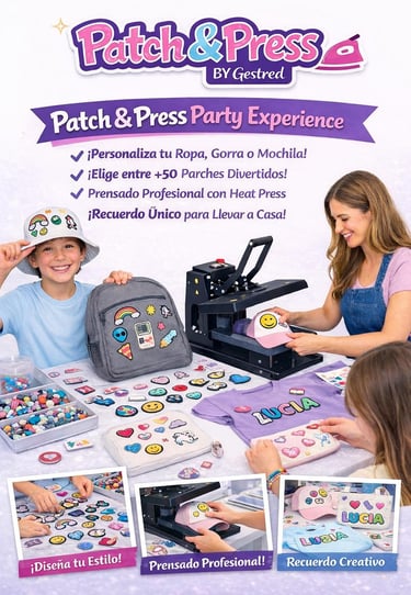 "En Patch & Press y Crystal Studio llevamos la creatividad al siguiente nivel con nuestra Custom Station. Transformamos gorras, prendas y accesorios en piezas exclusivas mediante la aplicación en vivo de parches termoadhesivos y cristales brillantes. Es más que un regalo: es una actividad interactiva donde cada invitado se convierte en diseñador."